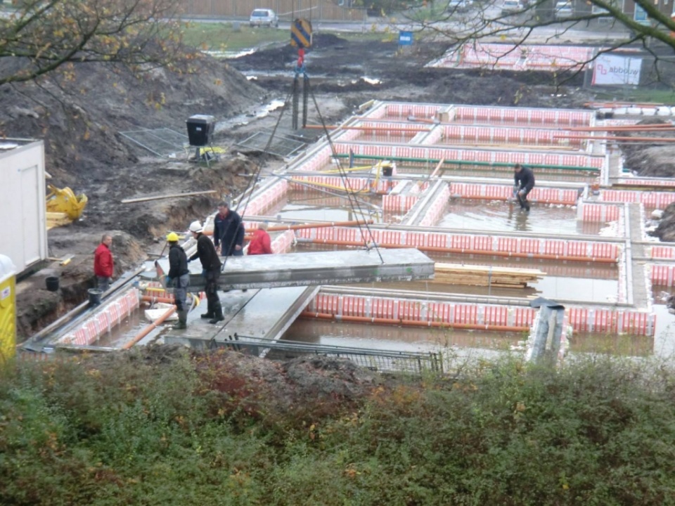 De beton voor de fundering is droog en het is daarom tijd om de vloerplaten erop te leggen. Met de vloerplaten erop wordt het pas echt duidelijk hoe de begane grond voor de nieuwe bewoners eruit gaat zien. De prachtige bovenaanzicht foto’s, gemaakt door de buurtbewoner Jan Pol, geven een mooi en duidelijk beeld van de eerste verdiepingen.