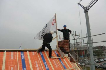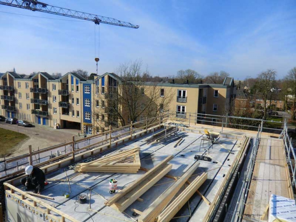De bouw van de Kloostertuin woningen gaat onverminderd door en het wordt steeds beter zichtbaar hoe fraai de woningen er uit komen te zien. De afgelopen weken zijn de bouwvakkers van AB Bouw en haar partners weer hard aan het werk geweest om zichtbare stappen te zetten. AB Bouw heeft de opbouw van de puntdaken verzorgd en een begin gemaakt aan het plaatsen van de kozijnen, terwijl Den Hartog Voegwerken bezig is geweest met alle voegwerk werkzaamheden.